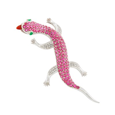 White Gold, Ruby, Diamond, Emerald and Amber Lizard Brooch