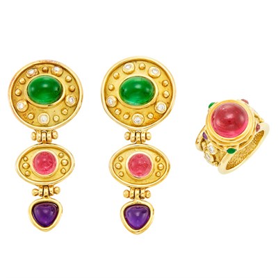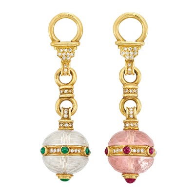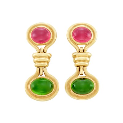 Pair of Gold and Cabochon Pink and Green Tourmaline Pendant-Earrings