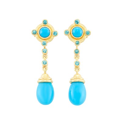 Pair of Hammered Gold, Turquoise Composite and Blue Topaz Pendant-Earrings, Elizabeth Locke
