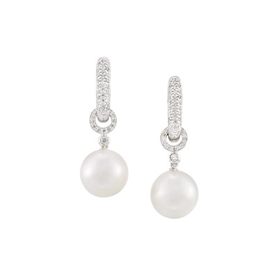 Pair of White Gold, South Sea Cultured Pearl and Diamond Pendant-Earrings