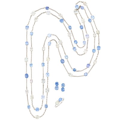 Long White Gold and Multicolored Sapphire Chain Necklace, Pair of Earclips and Ring