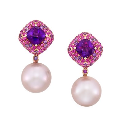 Pair of Rose Gold, Amethyst, Rhodolite Garnet and Pink Freshwater Pearl Pendant-Earrings
