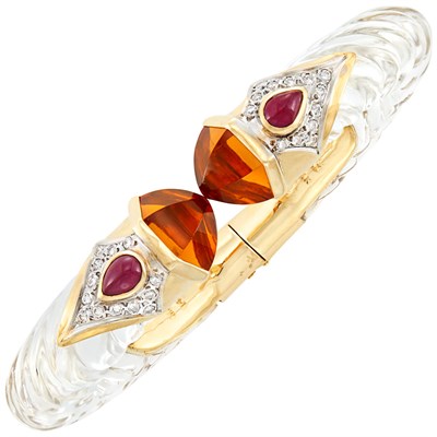 Gold, Fluted Rock Crystal, Citrine, Diamond and Cabochon Ruby Bangle Bracelet, Maz