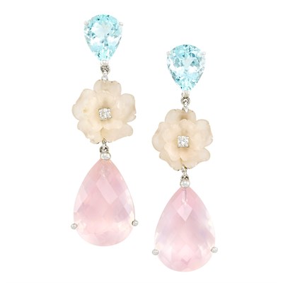 Pair of White Gold, Aquamarine, Rose Quartz and Diamond Pendant-Earclips