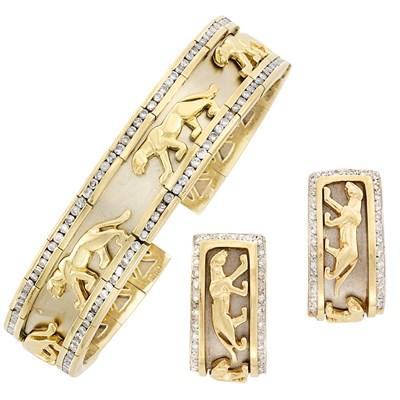 Gold, Steel and Diamond Panther Bangle Bracelet and Pair of Hoop Earrings