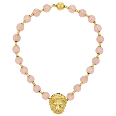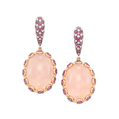 Pair of Rose and Blackened Gold, Diamond, Pink Sapphire and Rose Quartz Pendant-Earrings