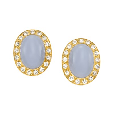 Pair of Gold, Blue Chalcedony and Diamond Earclips