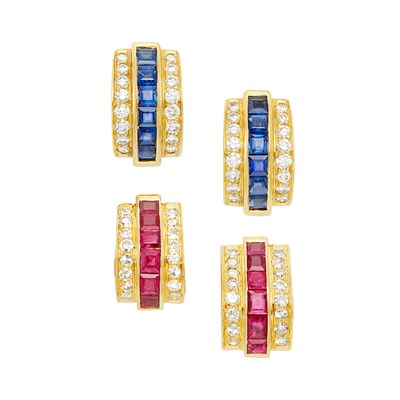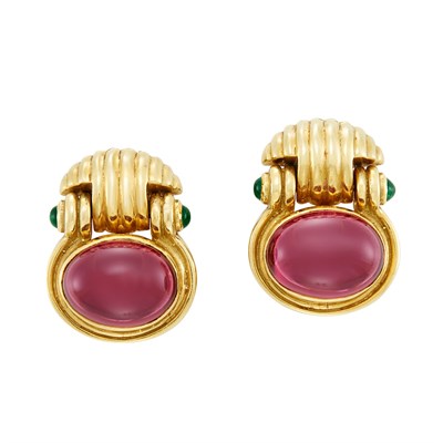 Pair of Gold, Cabochon Rubellite and Emerald Earclips