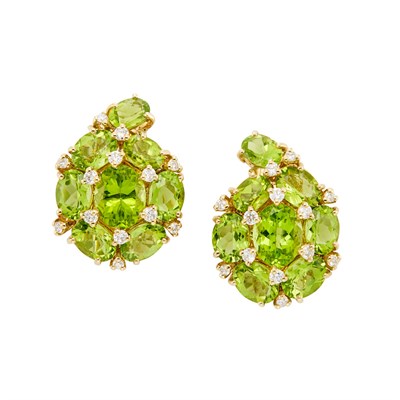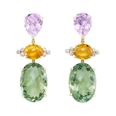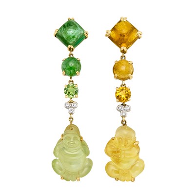 Pair of Gold, Tourmaline, Peridot, Diamond and Carved 'Buddah' Pendant-Earrings