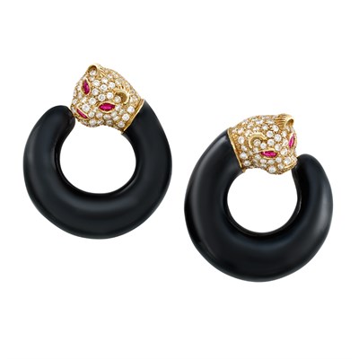 Gold, Black Enamel, Diamond and Ruby Panther Head Hoop Earclips