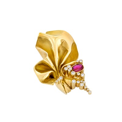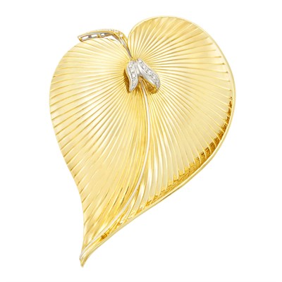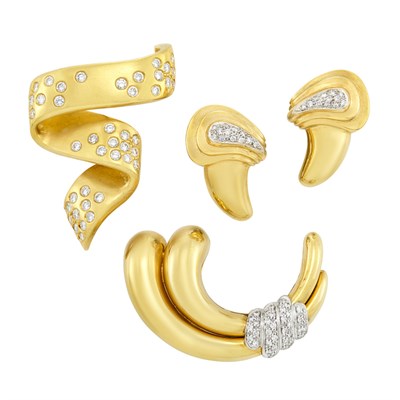 Gold and Diamond Ribbon Brooch, Marlene Stowe, Pair of Gold and Diamond Earrings and Brooch