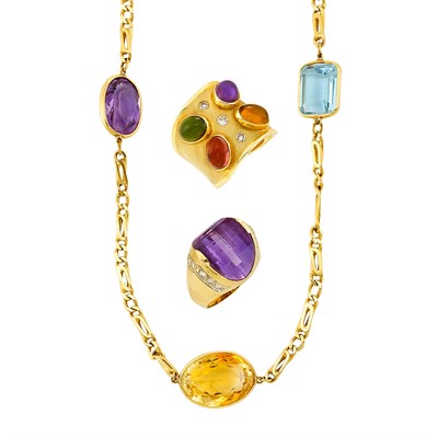 Long Gold and Gem-Set Chain Necklace and Two Rings