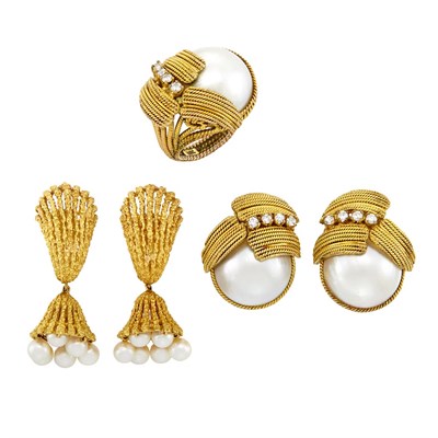 Group of Gold, Cultured Pearl, Mabé Pearl and Diamond Jewelry