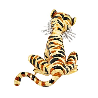 Two-Color Gold, Enamel and Diamond Tiger Clip-Brooch