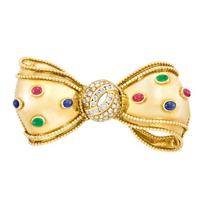 Gold, Diamond and Cabochon Gem-Set Bow Clip-Brooch