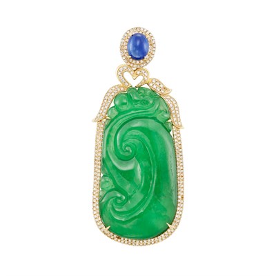 Gold, Carved Jade, Cabochon Sapphire and Diamond Pendant