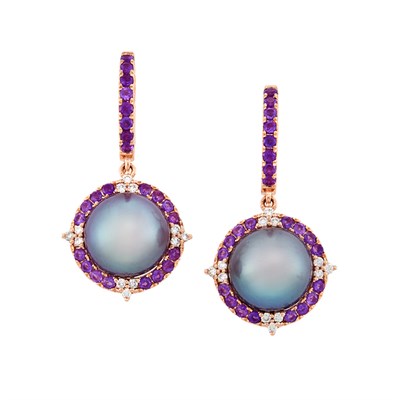 Pair of Rose Gold, Gray Freshwater Pearl, Amethyst and Diamond Pendant-Earrings
