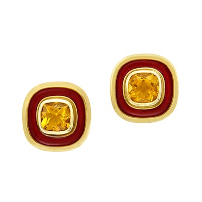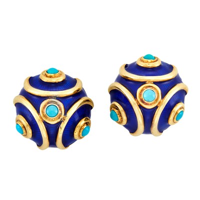 Pair of Gold, Blue Paillonne Enamel and Turquoise Earrings, Tiffany & Co.