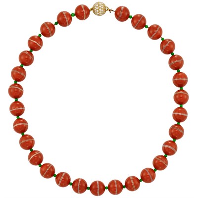 Banded Jasper and Emerald Bead Necklace with Gold and Diamond Ball Clasp