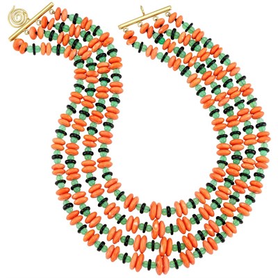 Four Strand Coral, Green Chrysoprase and Black Onyx Bead Necklace