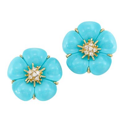 Pair of Gold, Carved Turquoise Composite and Diamond Flower Earclips