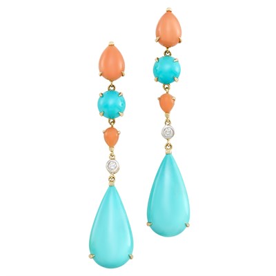 Pair of Gold, Coral, Diamond and Turquoise Pendant-Earclips