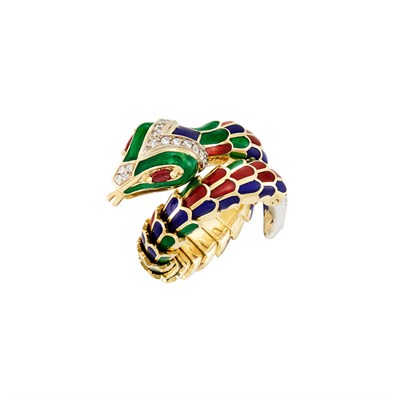 Two-Color Gold, Enamel, Diamond and Ruby Snake Ring