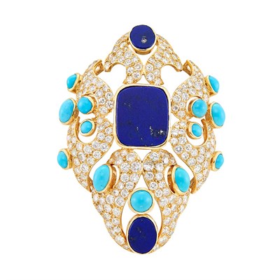 Gold, Diamond, Lapis and Turquoise Clip-Brooch, France