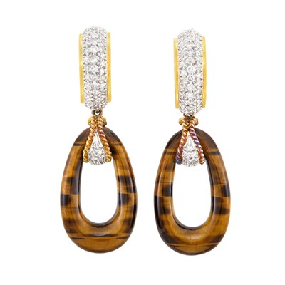 Pair of Gold, Diamond and Tiger's Eye Pendant-Earrings
