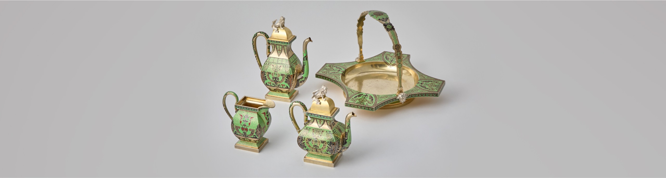 The sale was highlighted by a rare Russian silver-gilt and champlevé enamel tea and coffee service by Khlebnikov, Moscow, 1884, that achieved $108,450. One of Imperial Russia’s most celebrated jewelry firms, Khlebnikov enjoyed immense prestige during the late 19th and early 20th centuries, earning the distinguished title of Supplier to the Imperial Court. The firm was renowned for its exquisite decorative silver and enamel work that masterfully reinterpreted traditional Russian motifs and folk art.