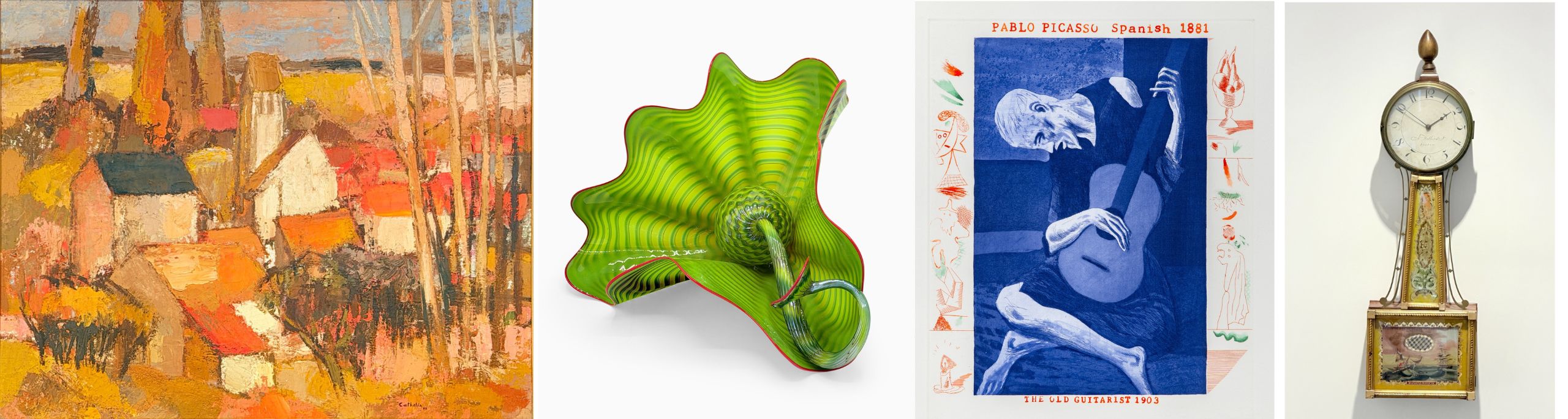 The couple’s style of collecting was undoubtedly influenced by Carol’s parents. While they did purchase works by major twentieth century abstract artists, including standout pieces by Alexander Calder (lot 1042) and Dale Chihuly (lots 1076 & 1077), it is clear that they primarily built their collection around objects that they loved. The result is a wonderfully eclectic group of artworks, furniture, porcelain, antiquities, and silver that tell the private story of this prominent, public-facing couple. Carol and Avram’s tastes trended more modern and contemporary than those of Sidney and Esther, but they also appreciated the modern traditional and impressionist styles that Carol’s parents favored. Works like Bernard Cathelin’s 1960 Vallee d’Orge (lot 1024) from the Rabb collection and David Hockney’s 1976 etching of Pablo Picasso’s The Old Guitarist (lot 1051) from the Goldbergs’ aesthetically bridge these two sensibilities and pull the collection into a cross-generational dialogue.