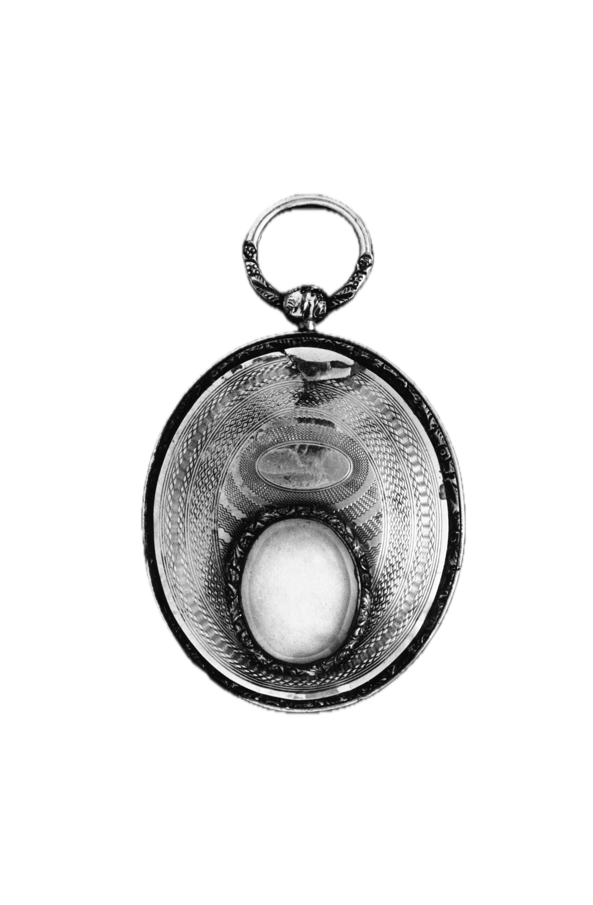 Fig. 2 Back of case with guilloché decoration and a glass-covered compartment for hair Image courtesy of Doyle