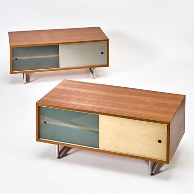 Pair of Eric Pfeiffer Cherry Stained, Blonde Wood, Metal and Tempered Glass Low Cabinets