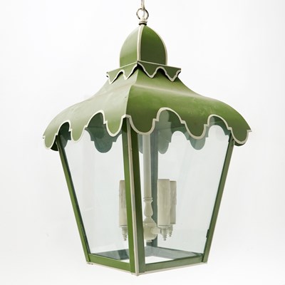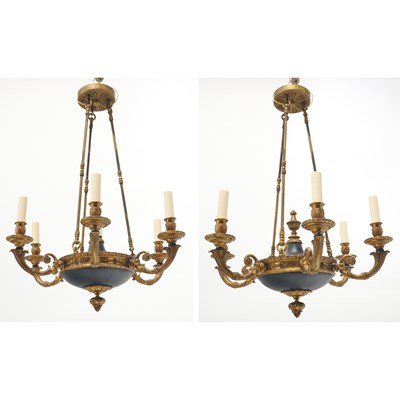 Pair of Empire Style Gilt and Black Enameled Metal Six-Light Chandeliers