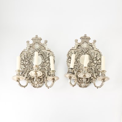Pair of Louis XIV Style Silver Plated Three-Light Wall Sconces