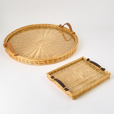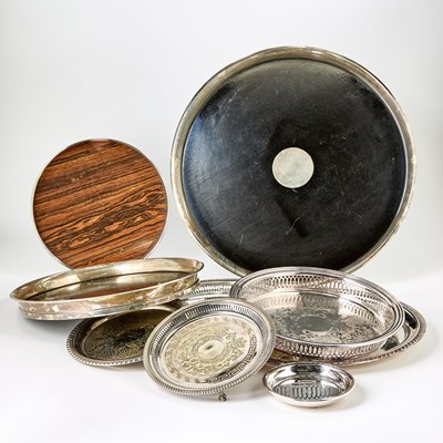 Two Gorham Sterling Silver and Laminate Drinks Trays and Eight Silver Plated Circular Trays