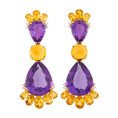 Pair of Gold, Amethyst, Citrine and Diamond Pendant-Earrings