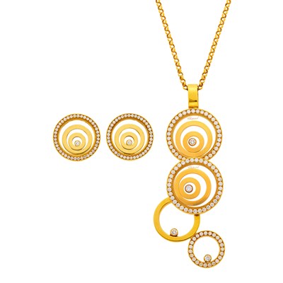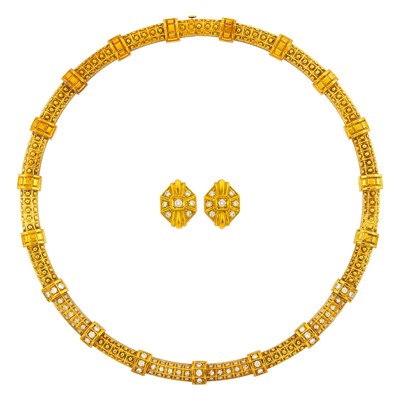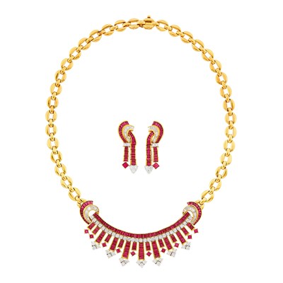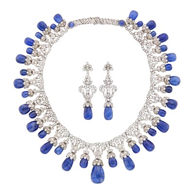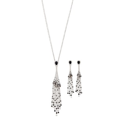 Silver, Sapphire and Diamond Fringe Necklace and Pair of Pendant-Earrings