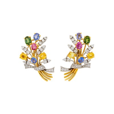 Pair of Two-Color Gold, Multicolored Sapphire and Diamond Bouquet Earrings