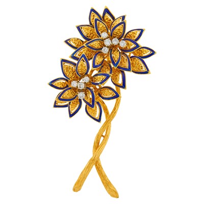 Gold, Diamond and Blue Enamel Flower Clip-Brooch