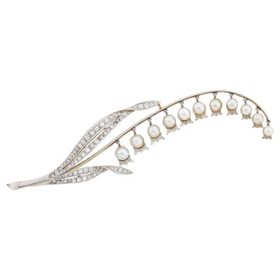 Antique Gold, Platinum, Button Pearl and Diamond Lily-of-the-Valley Brooch, France