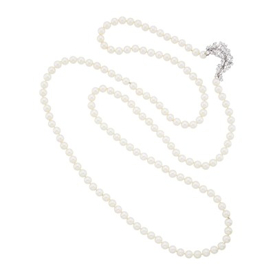 Long Cultured Pearl Necklace with Platinum, White Gold and Diamond Cluster Attachment