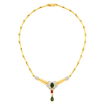Peter Lindeman Gold, Green Sapphire, Ruby and Diamond Necklace