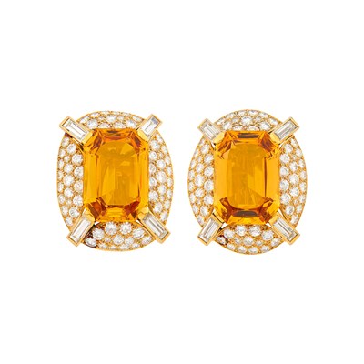 Pair of Gold, Orange Topaz and Diamond Earclips