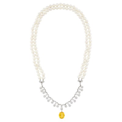 Double Strand Cultured Pearl, Two-Color Gold, Orangy Yellow Sapphire and Diamond Necklace