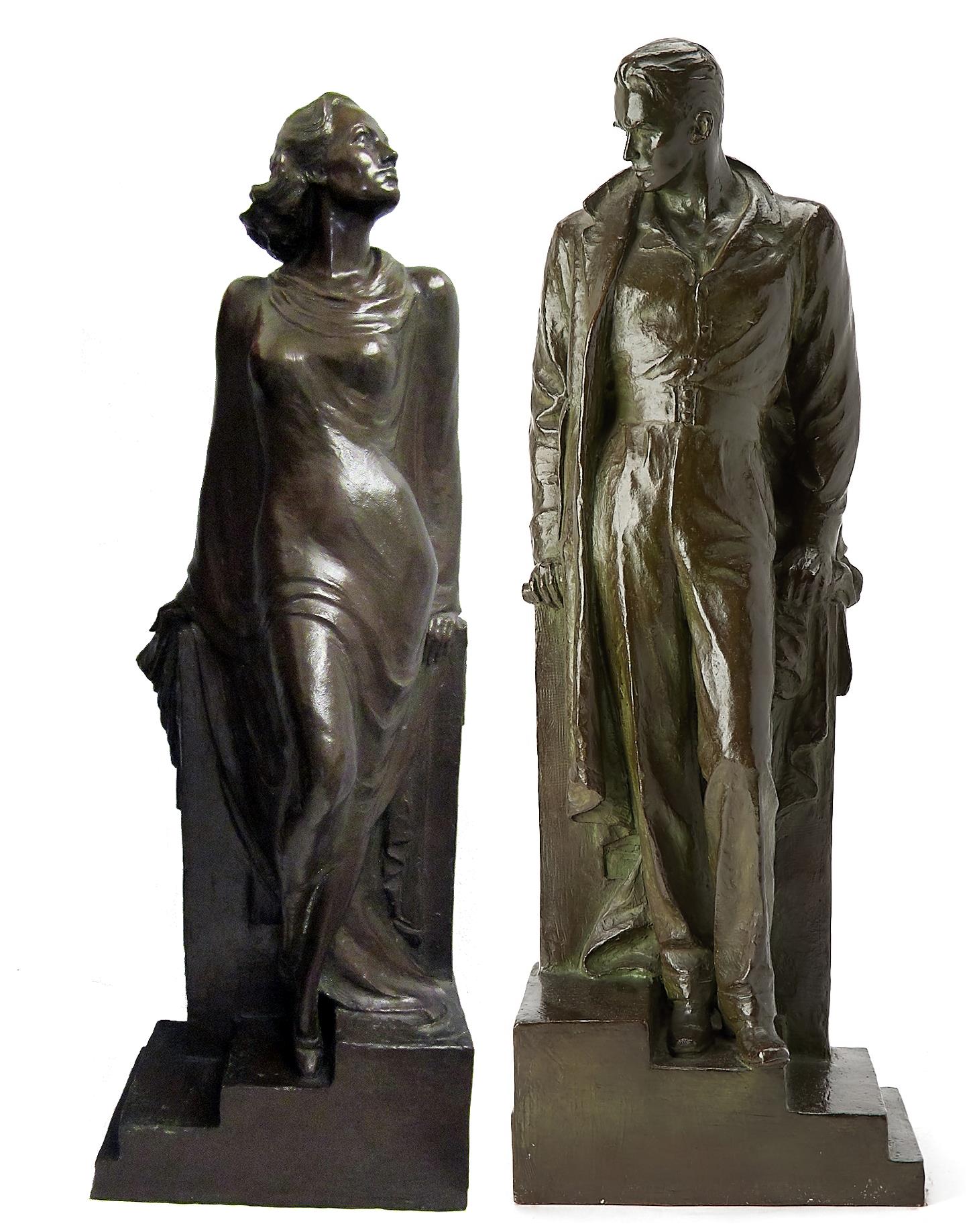 Douglas Fairbanks, Jr. recalled the sculptures but seems to have misremembered the artist who sculpted them, writing in his memoir Salad Days, "We were both sculpted by a Russian emigre, Prince Pierre Troubetzkoy -- small individual bronze figurines of ourselves -- and we had a couple of portraits done by reasonably good painters. Money went out as quickly as it came in, but I was rapidly catching up..." (Salad Days, p. 173). We know now that the bronzes were sculpted by Gilbert Riswold, in his day the well-known sculptor of large city monuments who had retired to Los Angeles in 1930. In his bronze, Fairbanks Jr. wears the long coat recalling his aviator uniform in Dawn Patrol (1930) and Joan is depicted in a long gown similar to those worn in This Modern Age (1931). Once reunited, we see that Douglas is looking down towards her while she gazes upward at him, the flow of her gown accentuating her lithe torso, filling the space, her right legbent at the knee causing the fabric to drape across her legs.