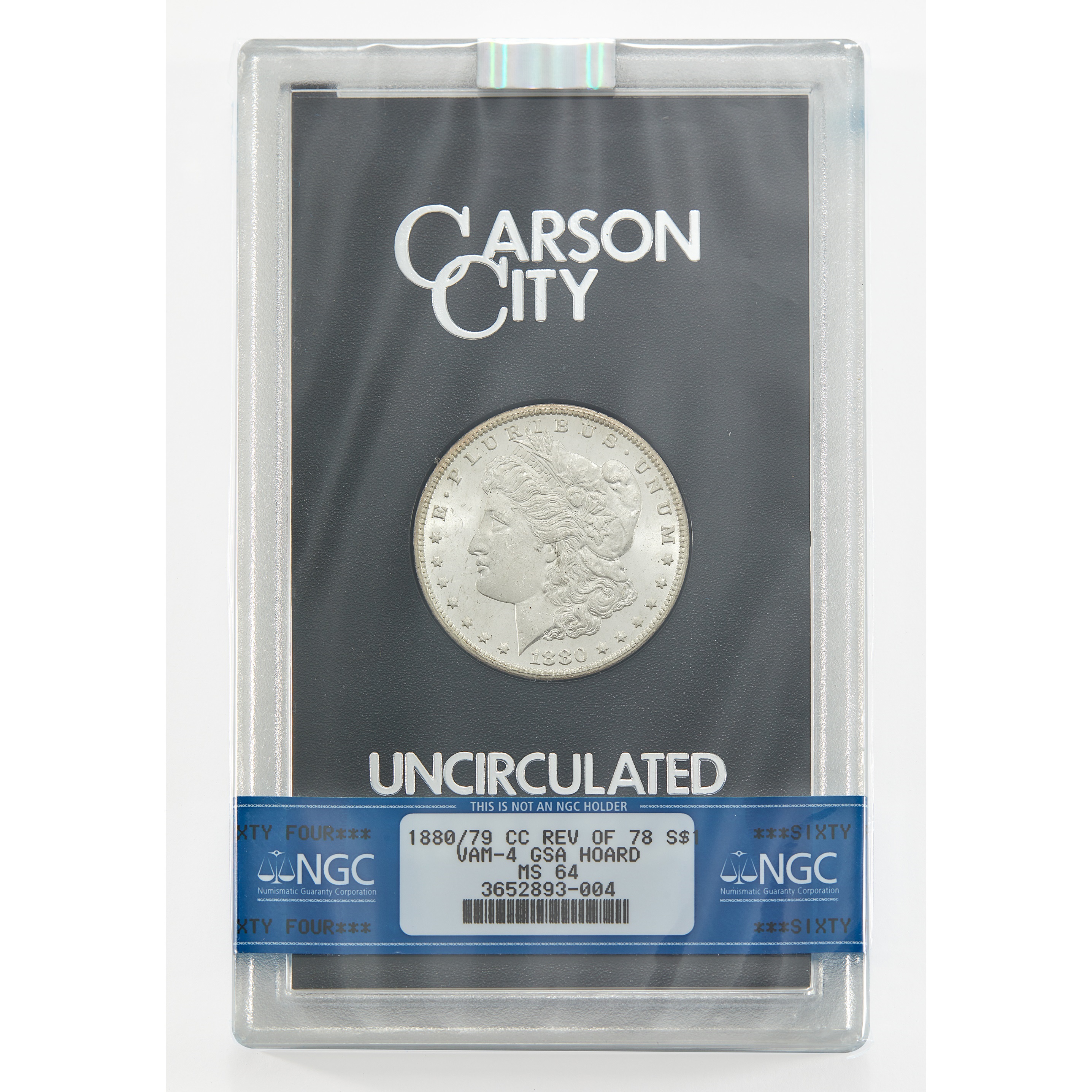 In the mid-1960s, the Treasury discovered bags of uncirculated silver dollars struck at the Carson City Mint, which traded at a premium relative to other silver dollars, owing to smaller mintages and, in some tellings, the mystique of the Comstock Lode and the “Wild West.” The General Services Administration (GSA) sold these coins in a series of sales from 1972 to 1980, preserving them in hard plastic cases with black boxes referred to by collectors as “hard packs.” In 2003, Numismatic Guaranty Company started grading and certifying Carson City Morgan Dollars, including many of the pieces available in the April 17 sale, affixing a band around the clear plastic holder bearing the grade and other relevant information. An 1880/79-CC Reverse of 1878 Morgan Dollar in a GSA Hard Pack well illustrates the layers of complexity in Morgan Dollar collecting: an example graded MS-64 by NGC appears in the April 17 sale (lot 6).