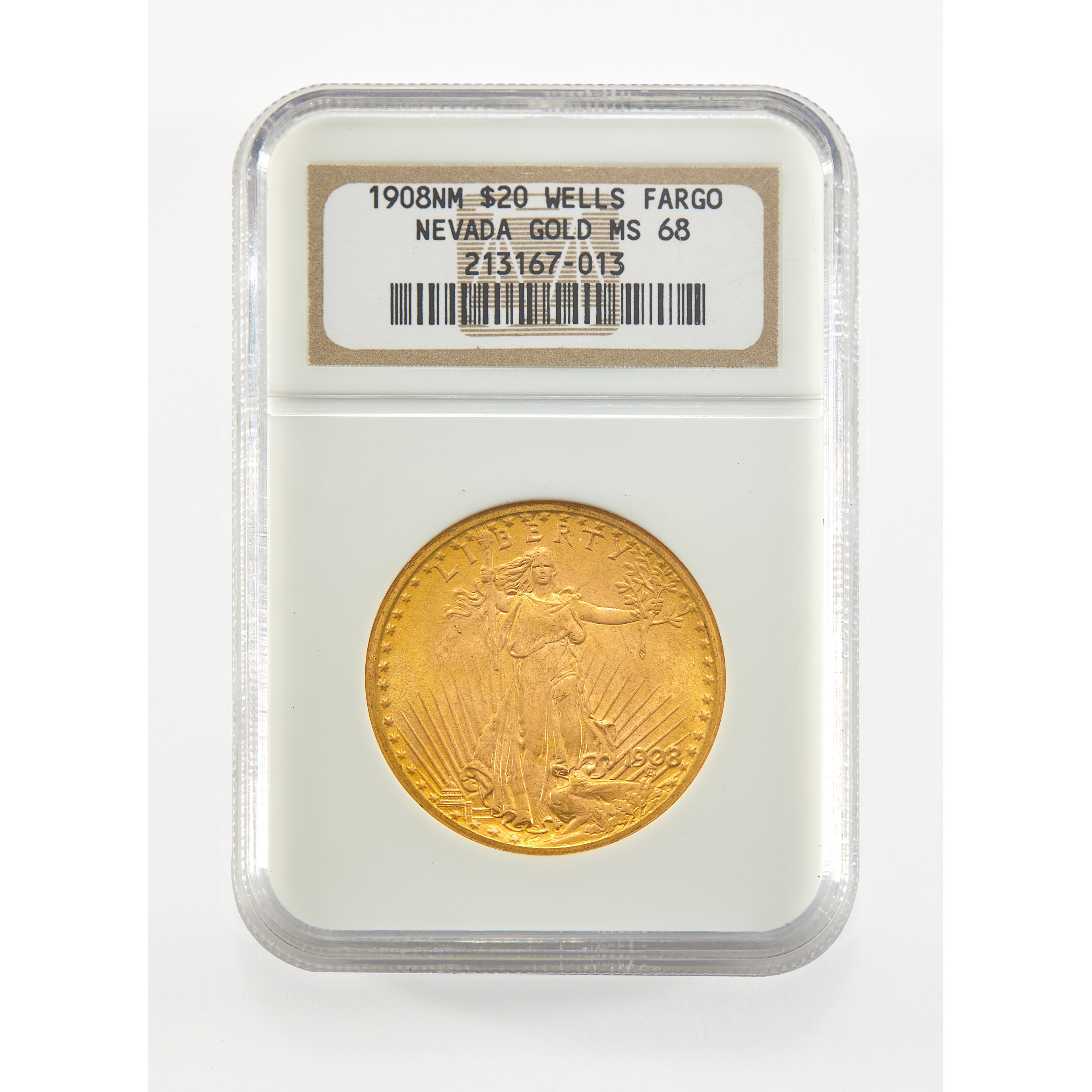 Another, assigned the unusually high grade Mint State 68 by NGC (lot 32), came from the Wells Fargo Hoard, a large group of exceptionally well-preserved 1908 No Motto Saint-Gaudens Double Eagles discovered in a Wells Fatgo bank vault in Nevada in 1991. A quick glance at NGC’s Census shows the impact of the hoard—1908 No Motto Double eagles account for the vast majority of all recorded grading events for Saint-Gaudens Double Eagles in MS-68. It is really the only date of the series accessible in that (near) top grade.